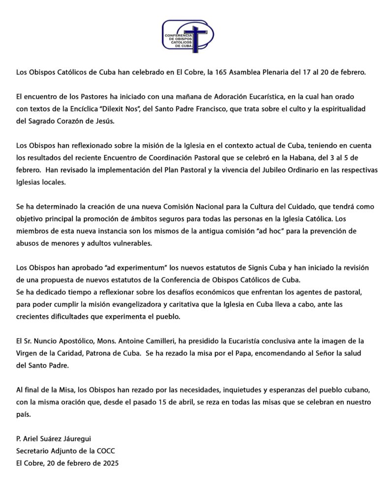 Entre los días 17 y 20 de febrero, El Santuario del Cobre, en Santiago de Cuba, acogió a los Obispos Cubanos, quienes se reunieron para su asamblea plenaria 165. La Encíclica “Dilexit Nos”, del Santo Padre Francisco, fue uno de los documentos que acompañó este tiempo de encuentro de los Pastores cubanos, que debatieron en una apretada agenda, temas vitales para el presente y futuro de la iglesia en la isla.