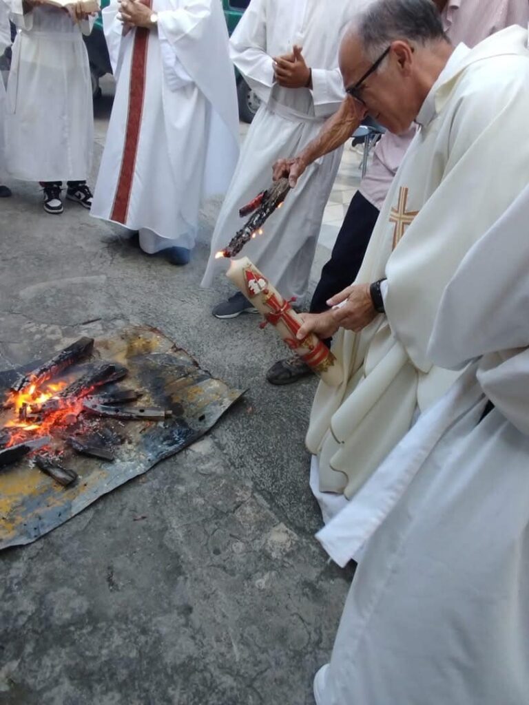 Dentro de la celebración el sacerdote lleva El Cirio Pascual, símbolo de Cristo resucitado, marcado con la cruz, el Alfa y la Omega (principio y fin) y el año en curso. También se presenta el agua bendita: Signo de purificación y vida nueva. Como parte de este momento se entona El canto del «Exsultet»: Himno de alegría que proclama la victoria de Cristo sobre la muerte. Se representa así el paso de la esclavitud del pecado a la libertad de los hijos de Dios.