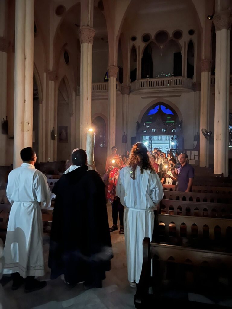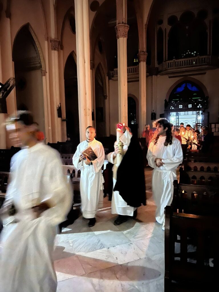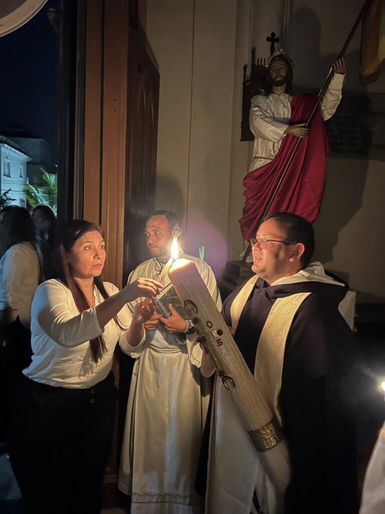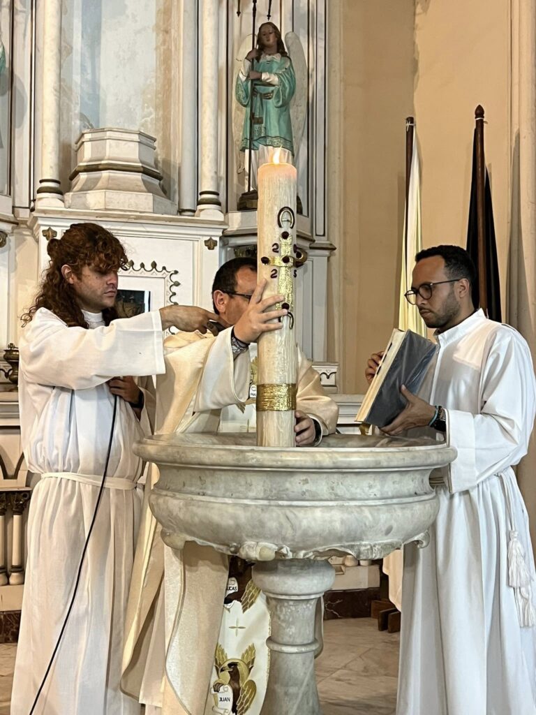 Liturgia de la palabra, en la que se proclaman nueve lecturas (siete del Antiguo Testamento y dos del Nuevo), que recorren la historia de la salvación, desde la Creación hasta la Resurrección. En Liturgia Bautismal, se bendice el agua y se renuevan las promesas del Bautismo, recordando que por este sacramento hemos muerto al pecado y resucitado con Cristo. Y en la liturgia Eucarística – La celebración culmina con la Santa Misa, en la que se comparte el Cuerpo y la Sangre de Cristo, anticipando la vida eterna.