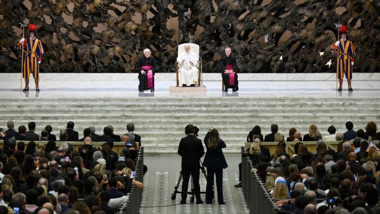 Ha sido esta la primera audiencia del Santo Padre en el Aula Paulo VI. Allí habló a los representantes de los medios de comunicación que han trabajado durante el cónclave. A los presentes les envió un agradecimiento por «el trabajo que han realizado y realizan en este tiempo, que para la Iglesia es esencialmente un tiempo de Gracia”,