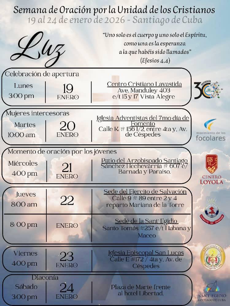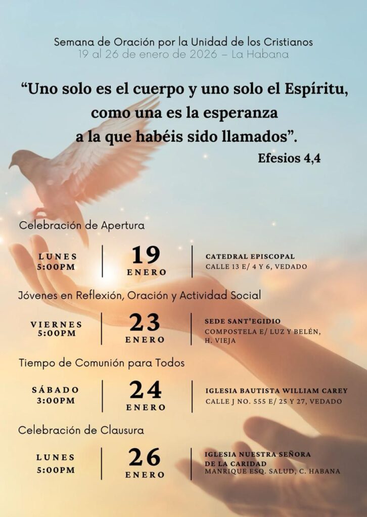 Este domingo comenzó en todo el mundo la Semana de Oración por la Unidad de los Cristianos, y en Cuba también se estarán desarrollando actividades durante estos días hasta el próximo 25 de enero bajo el lema “Uno solo es el cuerpo y uno solo el Espíritu, como una sola esperanza”. (Efesio 4, 4)