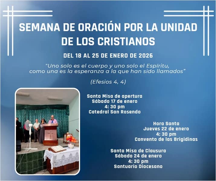 Con la celebración de la Santa Misa en la Catedral San Rosendo, inició este 18 de enero en la Diócesis de Pinar del Río, el Octavario de Oración por la Unidad de los Cristianos. Este jueves se realizará una Hora Santa en el Convento de las Hermanas Brigidinas y el próximo sábado 24, será la clausura con la Santa Eucaristía. Todas ellas a las 4:30 de la tarde.