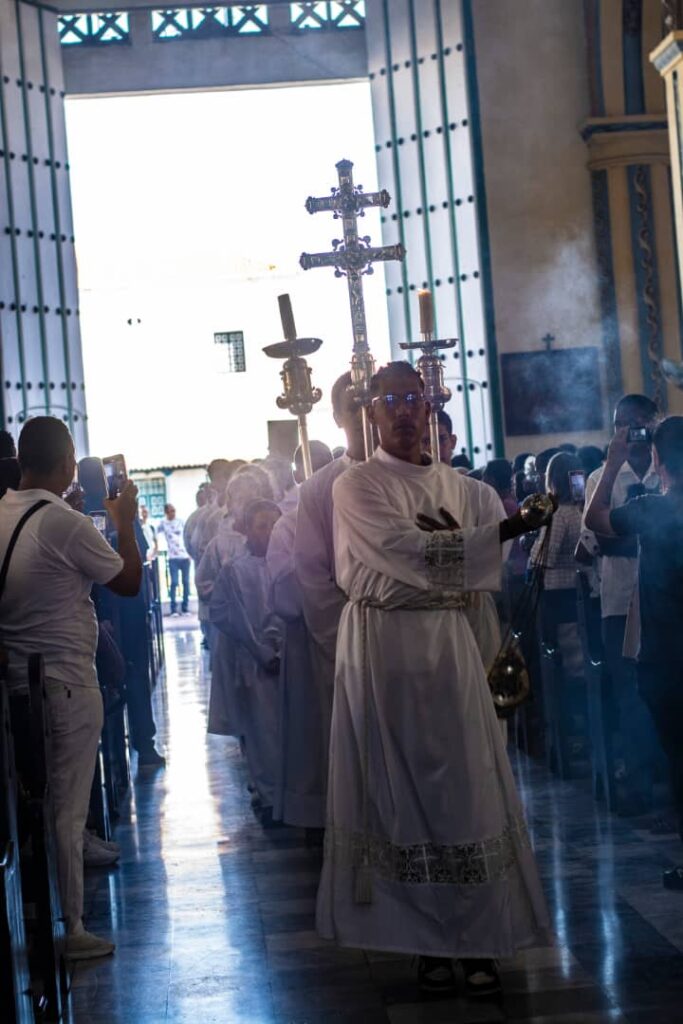 Nos dio tres puntos. “Mi experiencia. Dios me ha dado la gracia de tener conciencia de la llamada. Una. Dos, he tenido conciencia de que Dios es bueno, y que mis limitaciones el Señor las conoce, y que el Señor me dará fuerza para superarlas. Segunda. La tercera, no quito los obstáculos de la vida, ni a mí, ni a ustedes, pero el Señor me ha dado la fuerza para sortearnos con mayor o menor firmeza y fuerza. Hermanos, y eso es una garantía, y es una seguridad. Las pruebas de la vida. ¿Cuántas pruebas en el estudio, en la universidad, en el ordeño de las vacas, en el ser ingeniero, en trabajar en la calle, en ser seminarista, sacerdote, obispo? ¿Cuántas pruebas? ¿Cuántas? Que hay veces que uno las asume con temor y temblor. Pero, hermanos, hay que tomarlas con decisión. Y hay que tomarlas pidiéndole a Dios la fuerza y la ayuda, porque Él es el que tiene el poder y la gloria. No nosotros”.