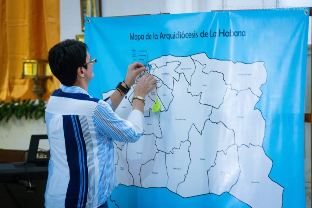 Con ese espíritu de familia, el director presentó un gran mapa de la Arquidiócesis de La Habana. Uno a uno, representantes de cada proyecto fueron avanzando para ubicar geográficamente su misión. Fue un momento visualmente poderoso: ver cómo puntos de luz “de caridad” se esparcían por toda la ciudad, de Caimito a Madruga, de la Habana Vieja a la Isla de la Juventud, confirmando que la caridad no conoce fronteras.