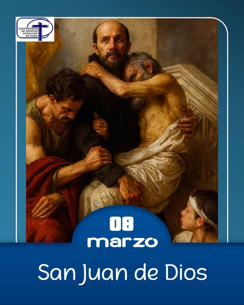 San Juan es un símbolo de la vocación de la Iglesia a hacerse ella misma caridad con aquellos que sufren en el cuerpo y también en el espíritu. San Juan de Dios O. H. nació en Montemor-o-Novo (Montemayor), Portugal, el 8 de marzo de 1495 y, coincidentemente, fue llamado a la Casa del Padre también un 8 de marzo, pero de 1550, en Granada (España). Su nombre de pila fue João Cidade Duarte, aunque el mundo lo ha conocido siempre como Juan, ‘Juan de los enfermos’.