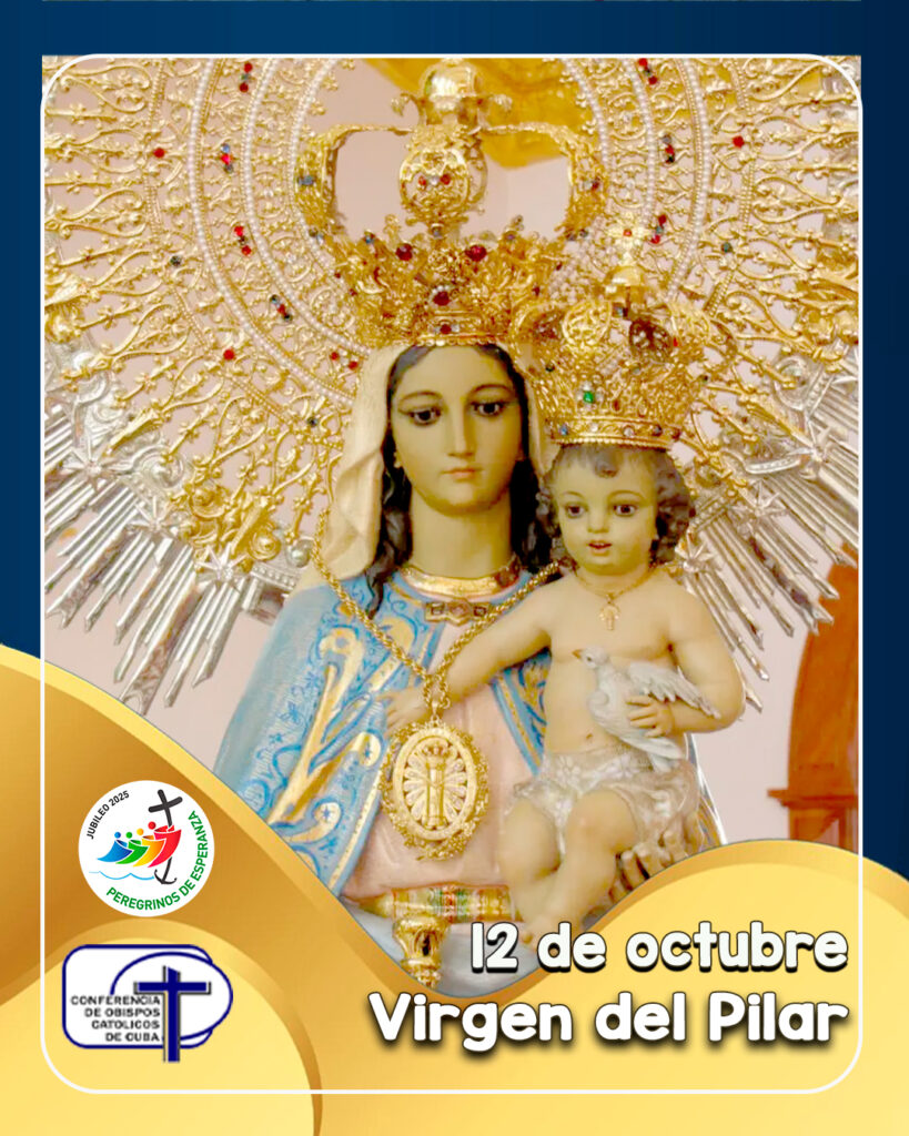 Patrona de la hispanidad, Madre de la evangelización. Cada 12 de octubre se celebra a la Madre de Dios bajo la advocación de la Virgen del Pilar. De acuerdo a una antigua tradición, el Apóstol Santiago llegó a la península Ibérica (España) para predicar el Evangelio; allí, mientras oraba, se le apareció la Virgen María, de pie, encima de un pilar o columna, en Zaragoza. Santa María vivía aún “en carne mortal”, por lo que se suele aludir a esta aparición como “la llegada de la Virgen”.